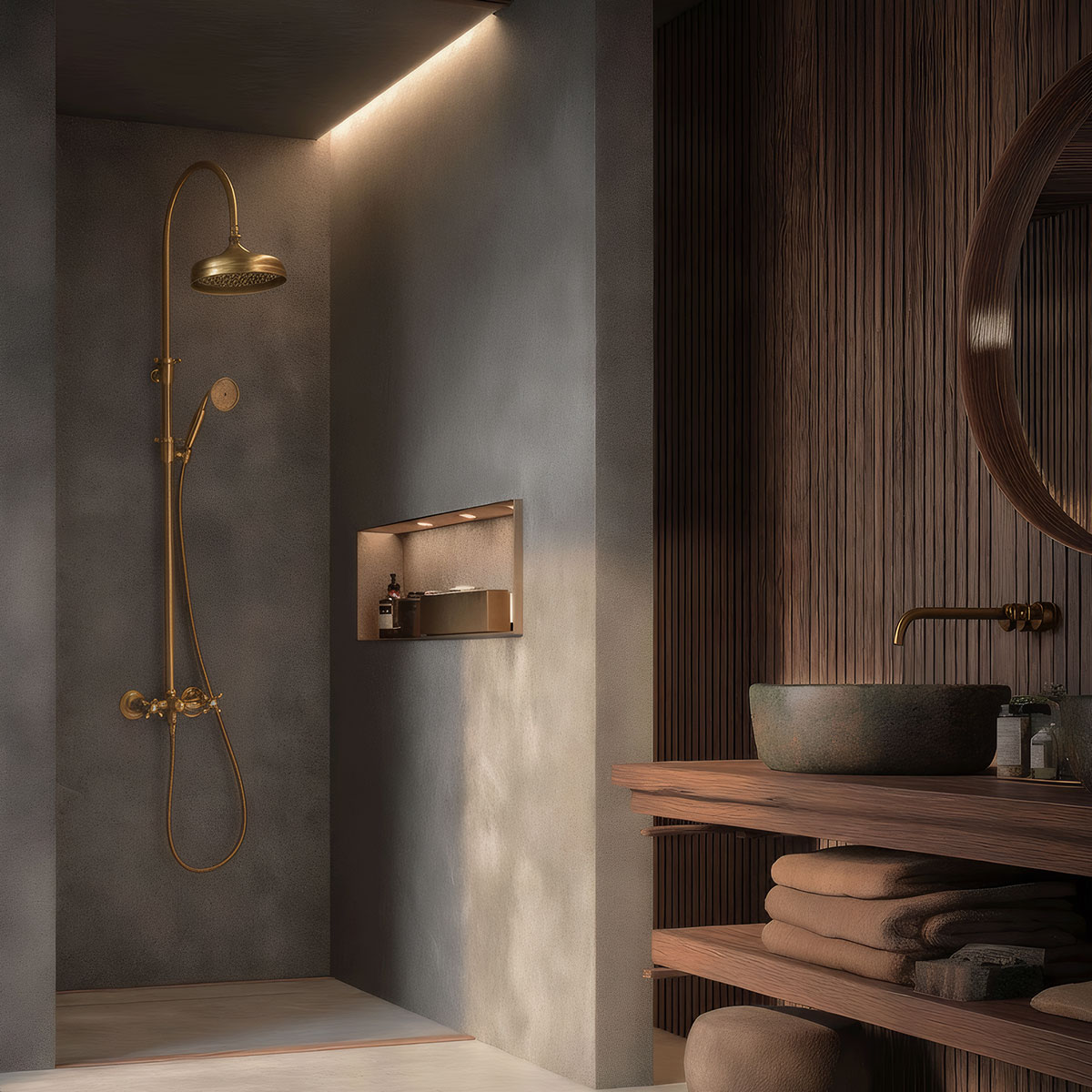 Talviset sisätilat elävät omaa rytmiään. Kodit alkavat hehkua sisältä päin, kun valo pehmenee ja ilma hidastuu. Loma-aikana lämpö, introspektio ja huolellisuus ovat siellä, missä ylellisyys löytyy pikemminkin kuin runsaudessa.Kylpyhuone, joka usein unohdetaan lomakoristelussa, on yksi hienoimmista tavoista lisätä hienovarainen ylellisyys kotiisi. Koko tunnelma voi muuttua oikeilla kalusteilla, erityisesti kultaisilla ja pronssisilla viimeistelyillä. Ne muuttavat käytännöllisen alueen rauhalliseksi turvapaikaksi, joka on sekä juhlava että klassinen.Nämä metallit eivät vaadi huomiota. Jopa minimalistiset kylpyhuoneet saavat niiden hehkun ansiosta rauhallisen suuruuden tunteen, joka vangitsee lempeän talvivalon ja tasapainottaa kylmät kivi- ja laattasävyt.